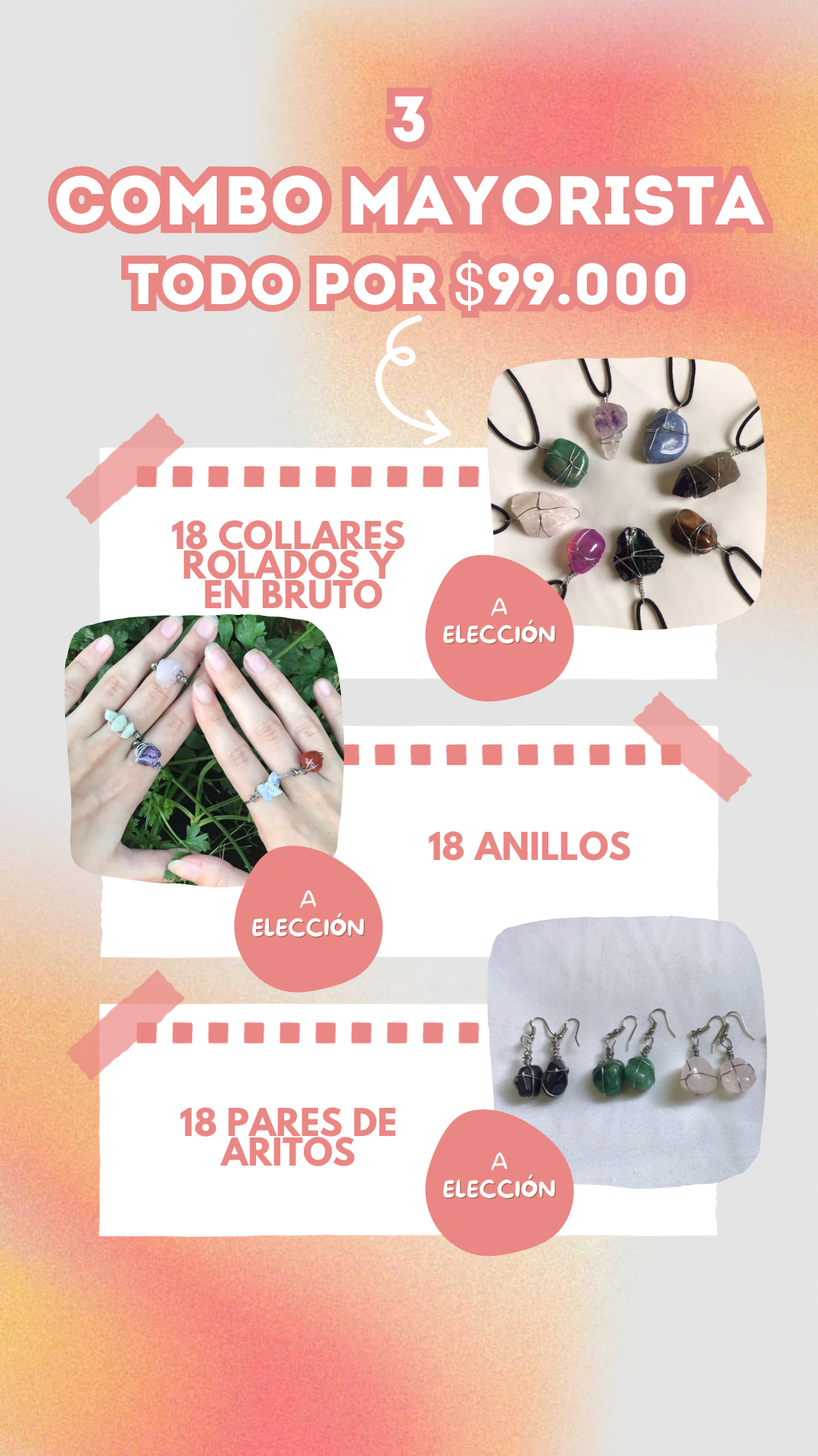 18 pares de aritos - 18 anillos - 18 collares rolados y en bruto (9 de c/u) = ¡54 accesorios!
